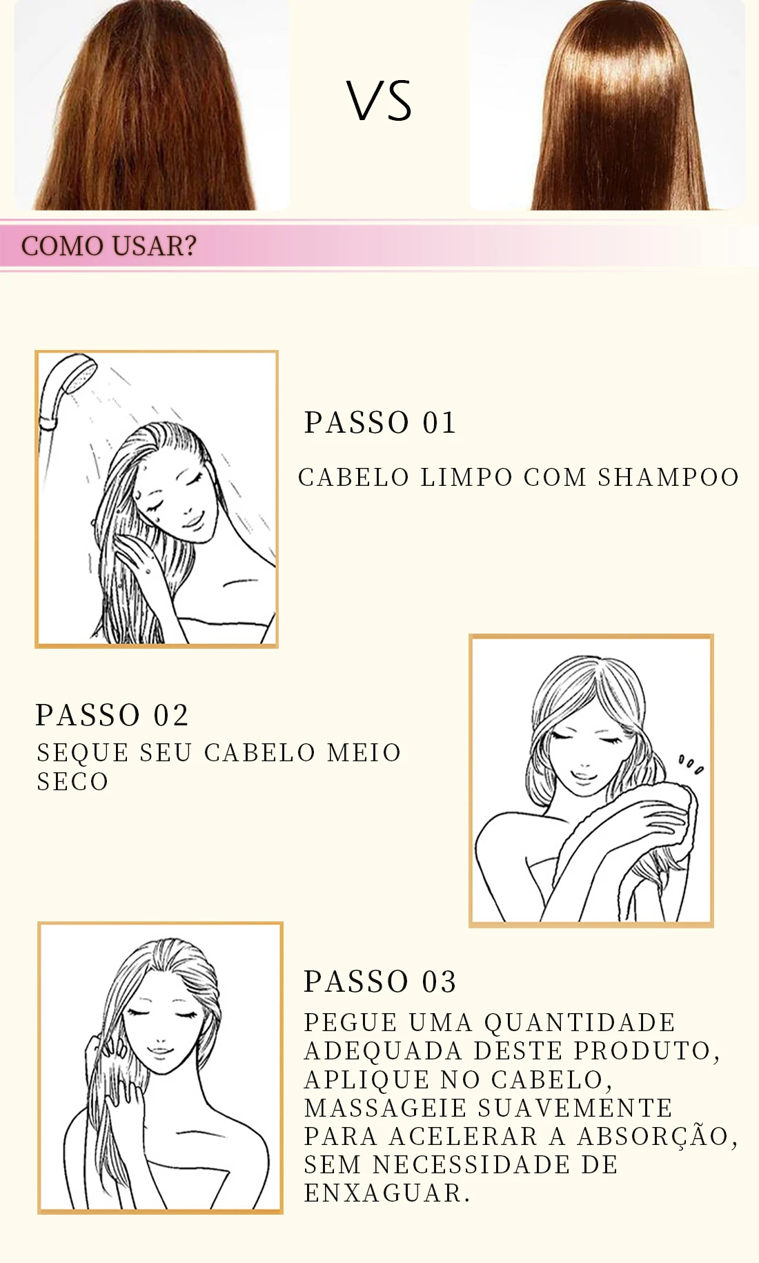 1. após a lavagem do cabelo, tome a quantidade apropriada deste produto no cabelo molhado, massagem suavemente para acelerar a absorção para aumentar o brilho do cabelo, não há necessidade de lavar novamente.
